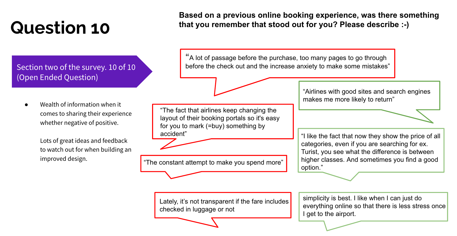 One crucial lesson emerged regarding the formulation of multiple-choice questions. For example, when asking users to select three important factors for flight booking, the responses were diverse, making it challenging to discern the primary reason. This underscored the importance of crafting questions thoughtfully to yield clear and actionable insights.
