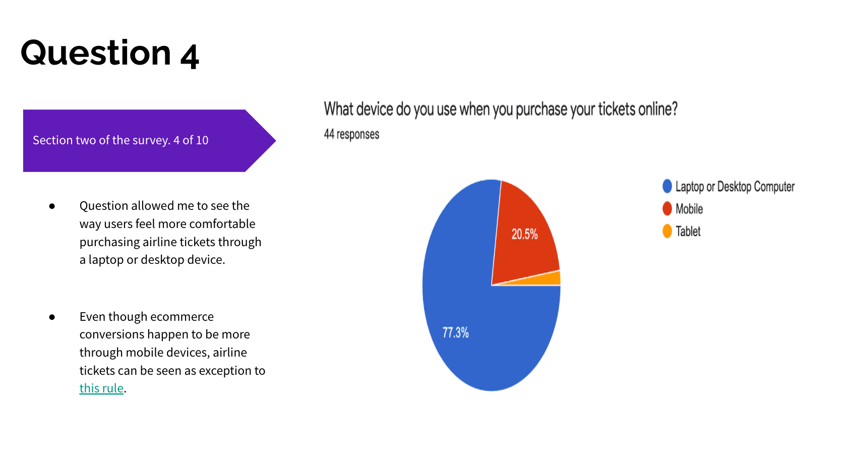 To gain a deeper understanding of our target users, I crafted a 10-question survey using Google Forms, which garnered 44 responses. All respondents confirmed having prior experience booking airline tickets.