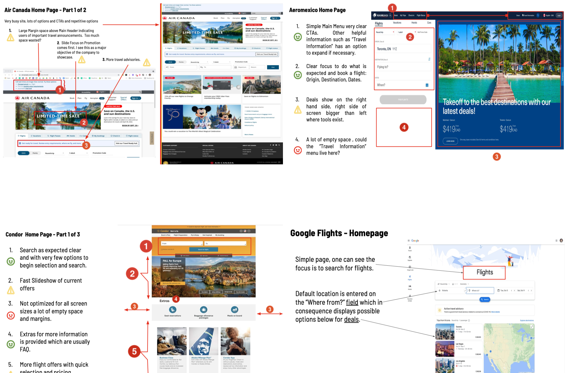 Looking into these websites was really helpful. I found some good things they do, but also some stuff that might make things harder for users. I checked out Air Canada, Aeromexico, Condor Airlines, and also Google Flights, which compares flights from different airlines. I picked them because they all do the same thing but in different ways. I wanted to see what's the same and what's different about them.
